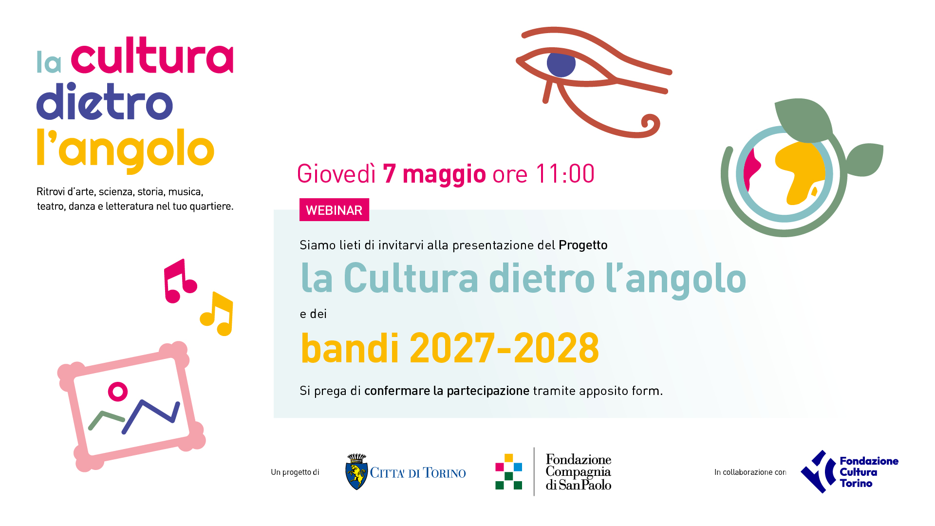 Fondazione per la Cultura Torino procede alla pubblicazione di due distinti Avvisi Pubblici a valenza biennale per l’individuazione di 7 spazi di comunità (di seguito denominati “presìdi territoriali”) (bando A), e di 8 istituzioni culturali (bando B) per la realizzazione delle attività del programma La cultura dietro l’angolo.